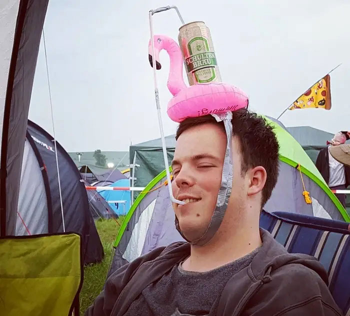 Numerous individuals find music festivals exhausting due to excessive walking. As a result, some individuals devise clever tricks to enjoy the event while also taking a breather. The individual in this photograph has creatively figured out a way to have a drink without needing to use his hands. It appears that he is having a great time while also keeping his comfort in mind. The highlight of this clever trick is its simplicity. All it requires is a flamingo to hold the beverage and duct tape to secure the toy in place.
