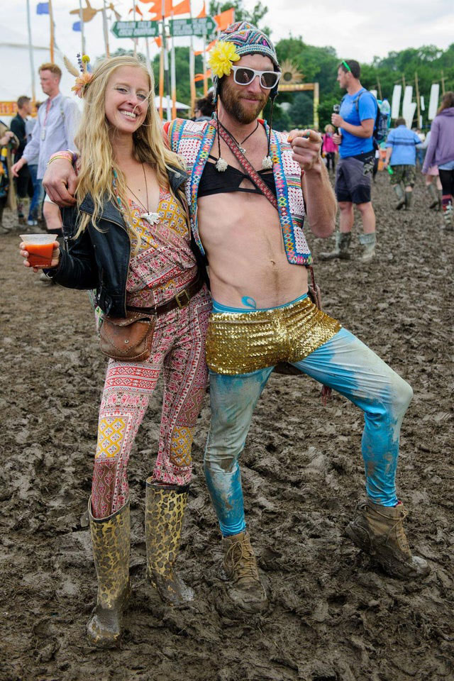 Another common thing you will see at every music festival is the glamorous couple. Some people dress funky with their partners, while others may wear shiny clothing. The couple in this picture falls in the latter category. The best part about their look is that they are wearing gender-neutral outfits. It is also visible that they were familiar with the venue and the mud that would be present. That is why they have put on long boots to protect themselves. The couple also looks proud of themselves and enjoying the event without caring about anyone else’s opinion.