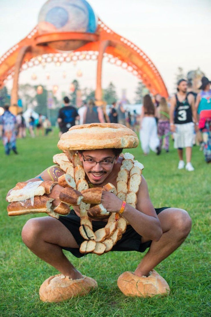 There’s a high chance that the wildest experiences of your life will occur at a music festival, primarily because of the uninhibited antics of festival-goers. Evidently, the individual depicted in this photo serves as a perfect example. It appears that this man has pilfered some bread for the unusual purpose of accessorising his attire. Yet his approach doesn’t seem to be on a mere juvenile impulse, as evidenced by his specially-carved bread shoes. He clearly took the time to mould the bread to his feet before arriving at the music festival.
