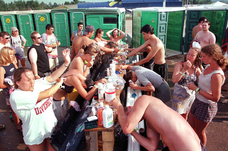 Attendees at music festivals often find themselves with abundant spare time to indulge in during the festivities. It’s not uncommon for them to accomplish some of their regular tasks on site. A characteristic sight you’ll often encounter is the line of people ready to bathe. They cluster around the tap-adjacent area near the public washrooms. Some festival-goers prefer a simple face wash, whereas others come adequately stocked with items like shampoo for a quick hair wash. The image above exemplifies the diverse range of individuals that frequent music festivals.
