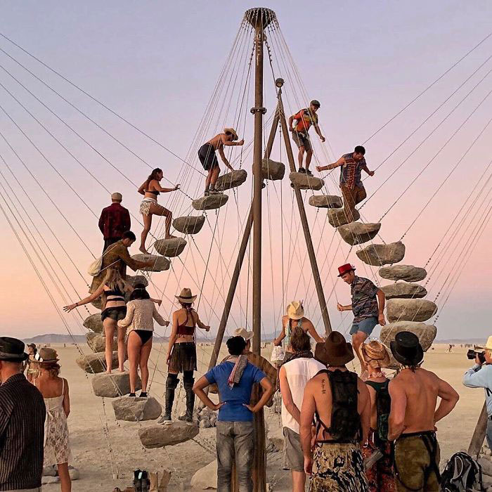 Each music festival features a distinctive art installation that captures the crowd’s interest. Sometimes, this art piece may be an imitation phone booth, but the festival in this photo has upped the ante with a stone staircase. The appeal of this exhibit lies in the fact that it gives attendees the opportunity to participate in a playful activity and take incredible photos. However, using such stairs requires careful balance and coordination since there may not be a handrail available in case someone loses their balance and risks falling.